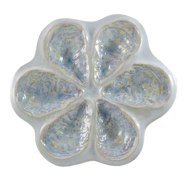 This platter is essential to any oyster lovers dish collection. It serves six oysters on the half shell; the grooves help keep the shells upright so precious juice doesn’t spill from the shell. The platter is purposefully thick and can be placed in the freezer to chill so the messiness of ice can be avoided. Designed with the Condiment Dish for oyster accouterments. Â