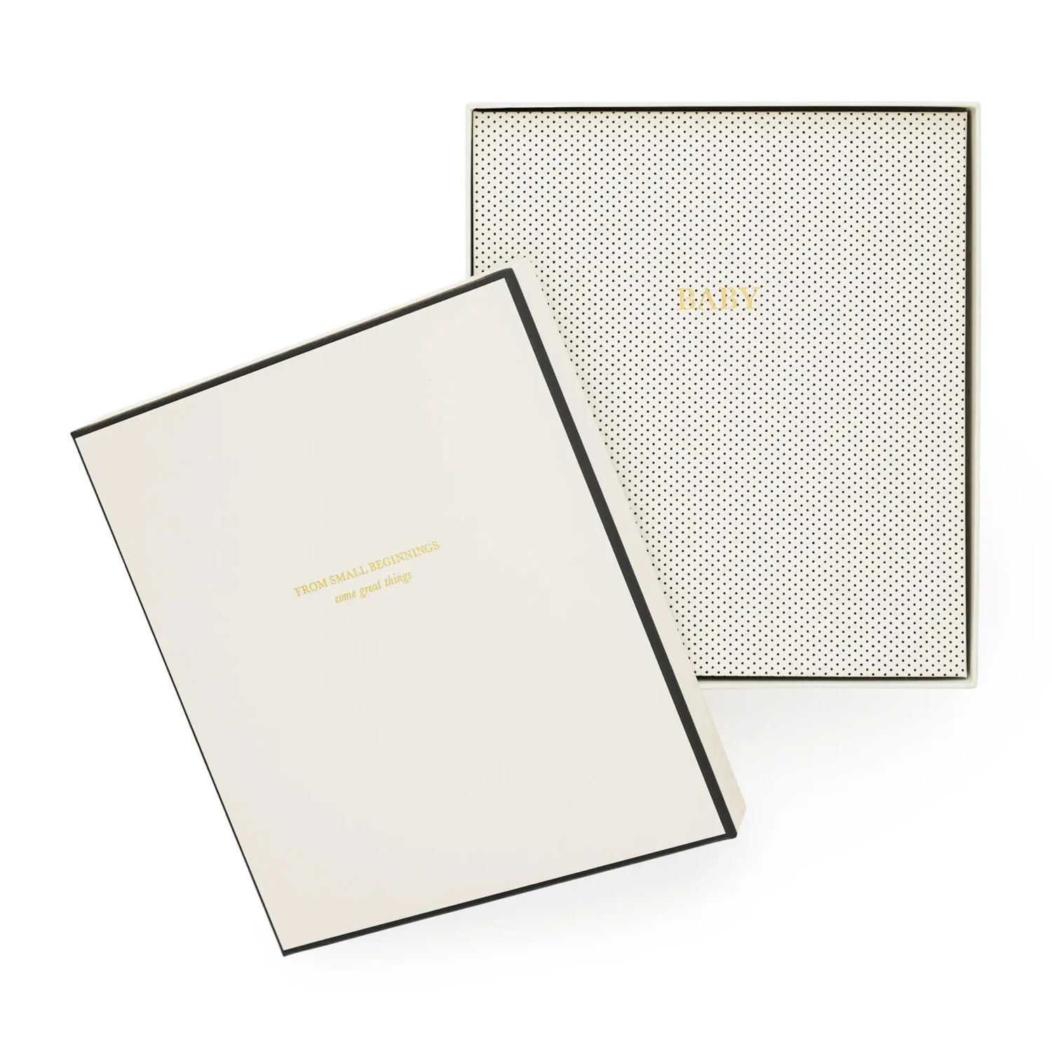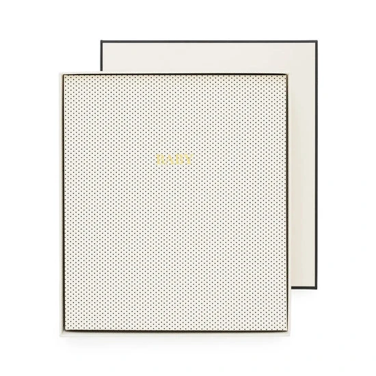 It’s the baby book we wish we had when they were born, and can’t wait to fill out as they grow. Thoughtful details include envelopes for loose keepsakes, a place for “A letter to my baby”, month to month milestones, “The way we told everyone you were coming” and “Things I don’t want to forget”. Made to fit 4×4 photos, it comes with adhesive to keep each moment in place on extra thick paper with gold foil detail throughout. Packaged in a matching gift box.