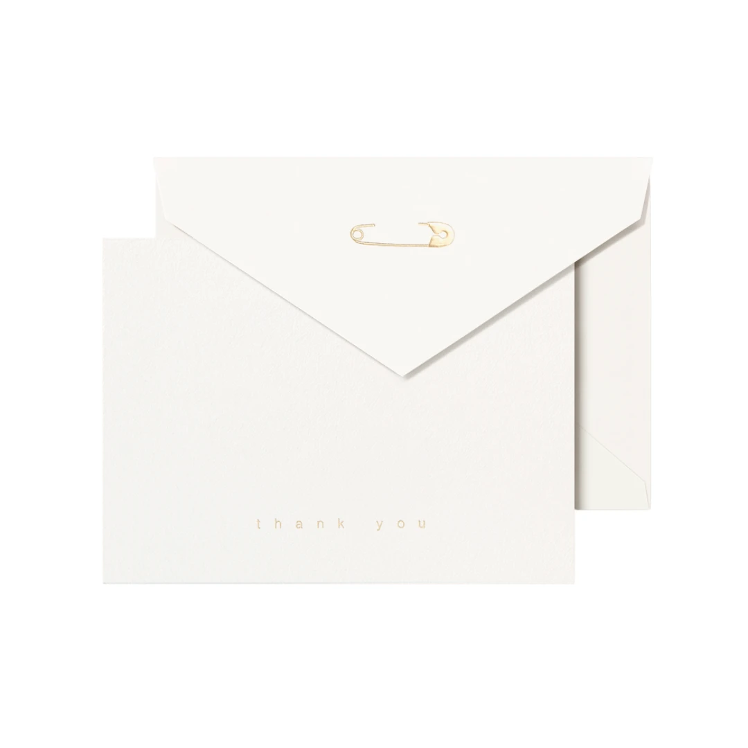 When your family is expecting a new member, nothing is more touching than the kind gestures of your community as they offer their support and excitement. Elegant and sweet, with a gold foil diaper pin on the envelope flap to suit the occasion, these notes of gratitude will give you plenty of space to reflect on each kind gesture.