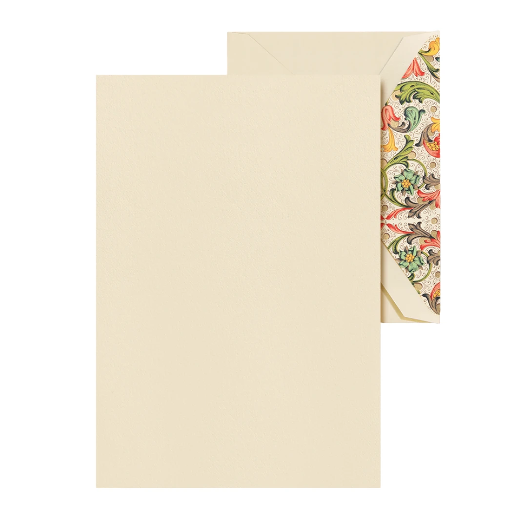 Anytime inspiration strikes, you’ll be ready to compose a letter on the Red Florentine Half Sheet. Made from fine, warm white paper that’s soft to the touch thanks to its pure cotton content, the letter sheet itself provides a blank canvas for all your thoughts. When your message arrives at its destination, your recipient will love opening the envelope to find an exquisite, floral envelope liner in reds, greens, and golds.