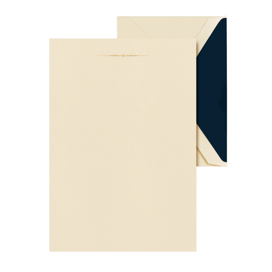 Crane’s fine, all-cotton half sheets are just the right size for composing a thoughtful letter. Engraved at the top with a gold ornamental motif and lined in classic navy, this stationery set is just the thing to have on hand when inspiration strikes.