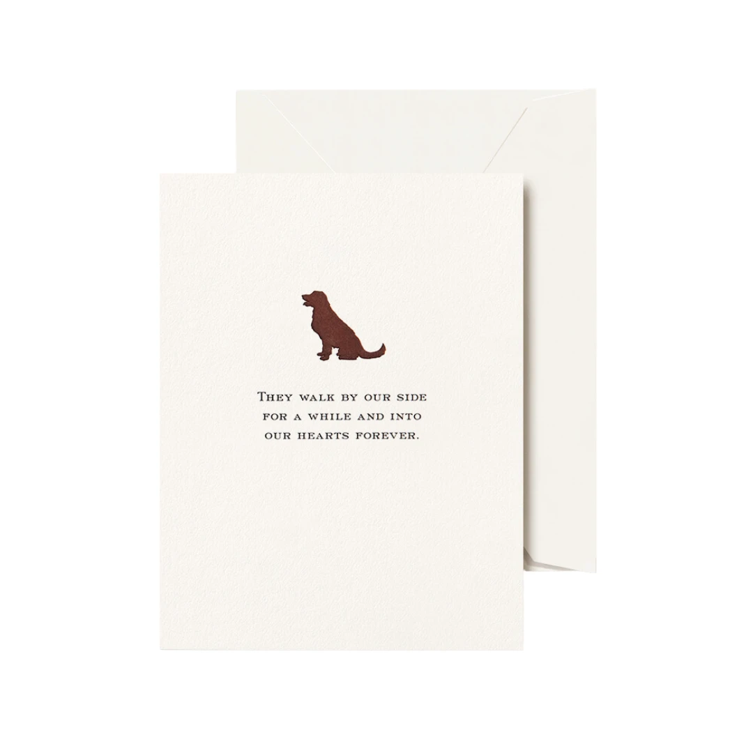 Dogs so often become part of the family, and pet lovers know their loss deserves gentle acknowledgement. This engraved card on pure cotton paper will help you find the words to express your sympathy. The inside reads, “So sorry for the loss of your faithful companion.”