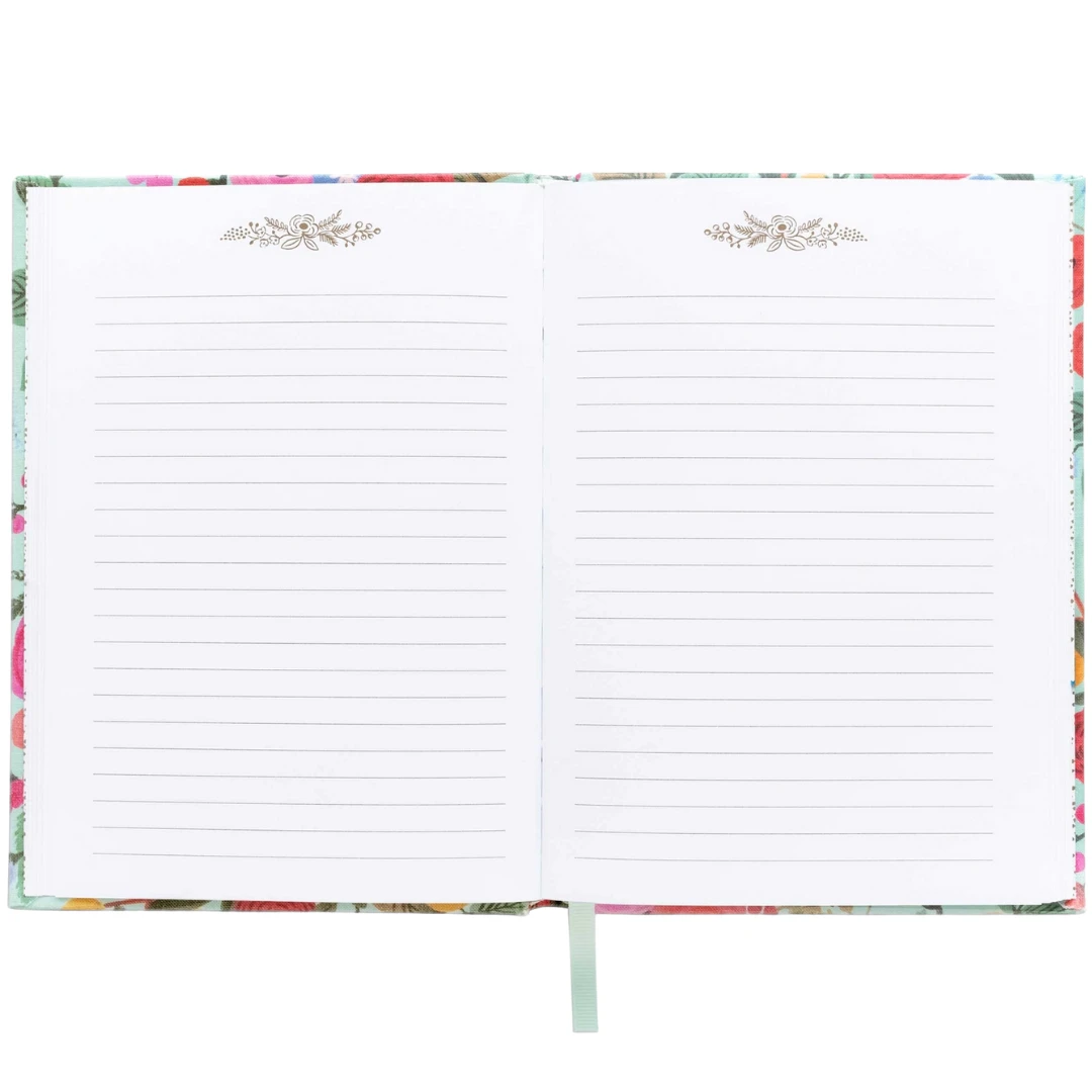 Let the Garden Party Fabric Journal inspire your storytelling with each turn of the page. It features a hard cover wrapped in printed book cloth, lay-flat binding, a coordinating bookmark, and gold foil accents.