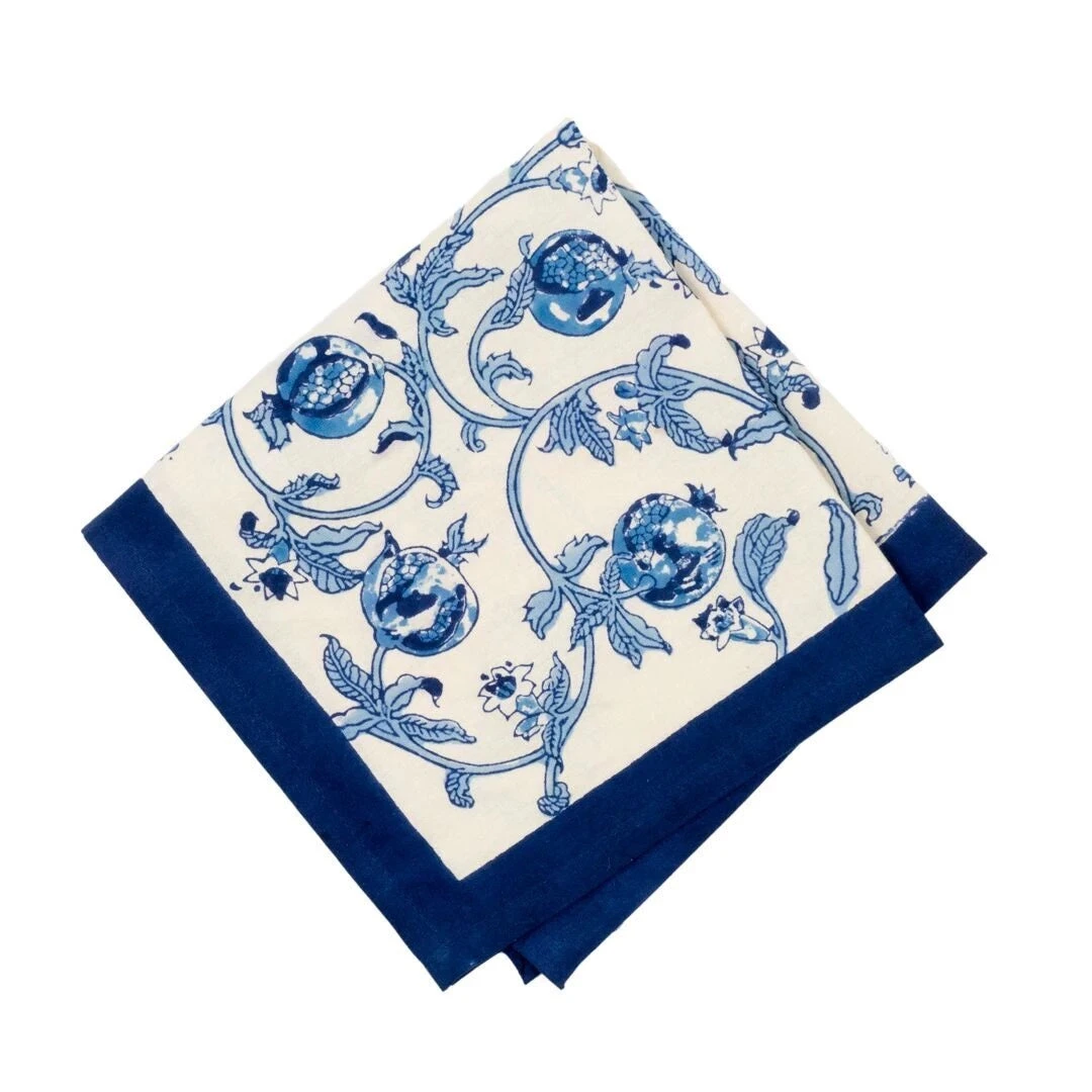Featuring a delicately intertwined floral pattern with iconic royal blue pomegranates atop a white background
