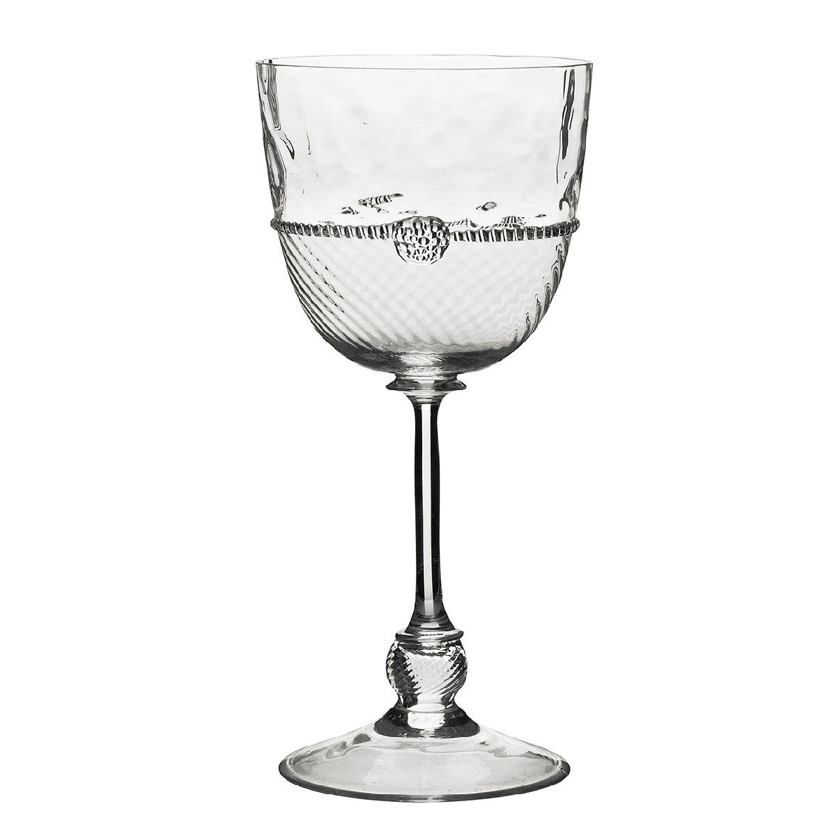 Clear and optic glass join in the Graham silhouette, married by a thread and berry detail. A spiraled sphere grounds the leggy goblets. The result – simply stunning.