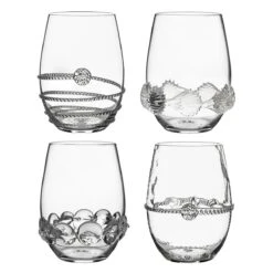 Each mouth-blown stemless wine glass in this set of four features a different signature bohemian motif to create a set that is as handsome as it is unique. Packaged in a signature teal gift box for easy gift giving for a newly engaged couple, a generous hostess or new homeowners.