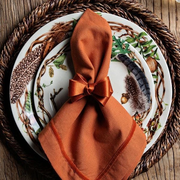 This woven napkin in a handsome pumpkin hue is trimmed with velvet ribbon to add an Autumnal elegance to seasonal settings, or a pop of color to an everyday whitewash tablescape.