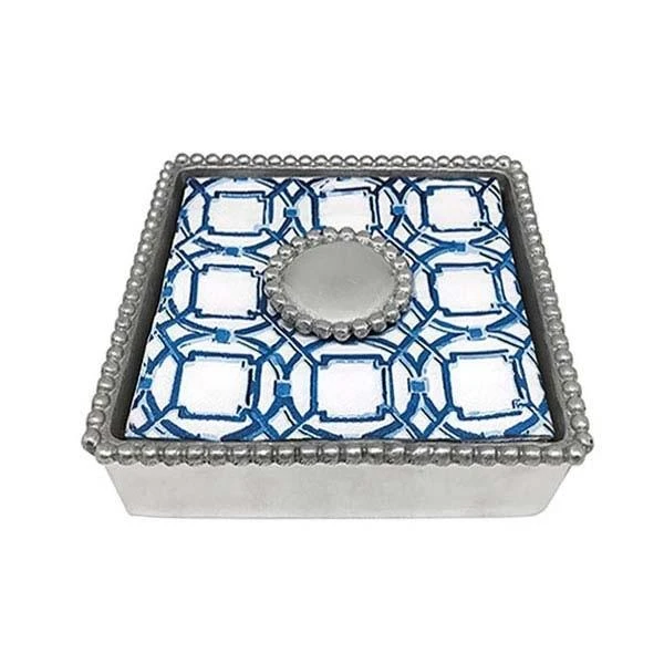 A Beaded Cocktail Napkin Box, paired with a Pearled Weight and a stack of cocktail napkins, featuring a soft teal pattern.
