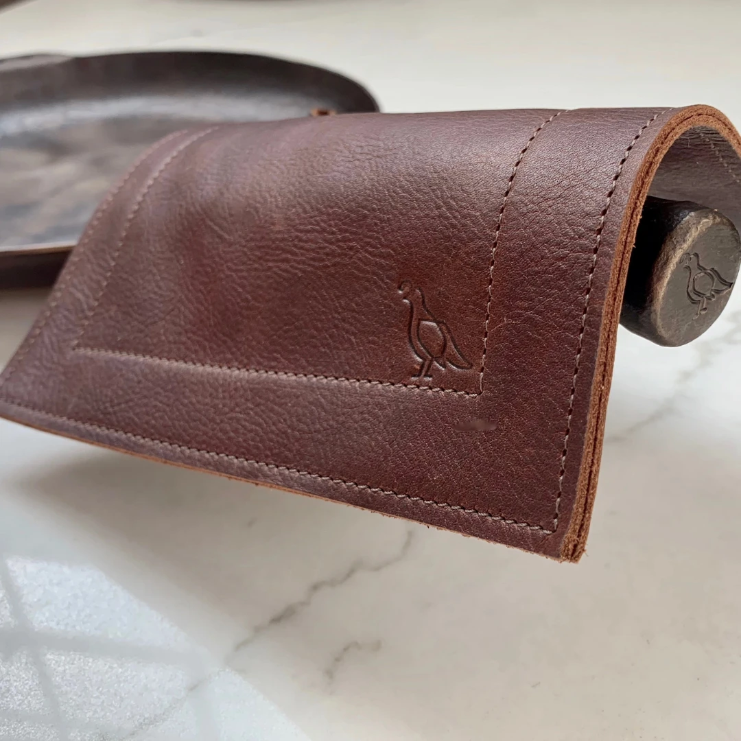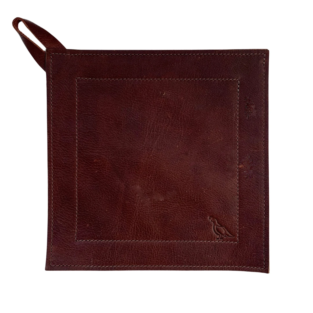 Hand stitched and branded with the Smithey logo over the same high-grade leather as the Smithey sleeves, this potholder is the most high quality and reliable holding tool we’ve ever used. Like cast iron, it gets better with time. Perfect for pulling a Smithey out of the oven or off the campfire. Use as either a trivet or as a traditional potholder.