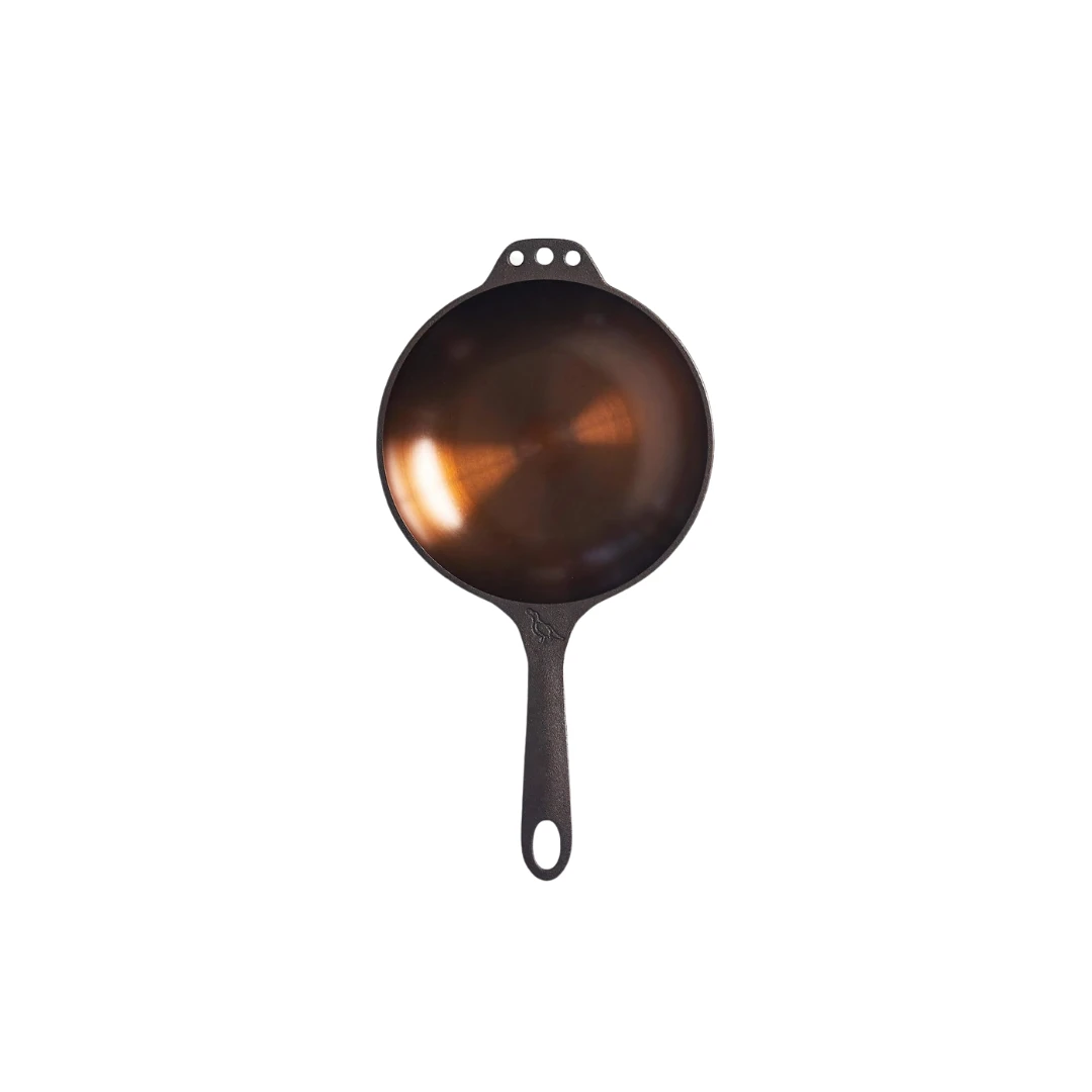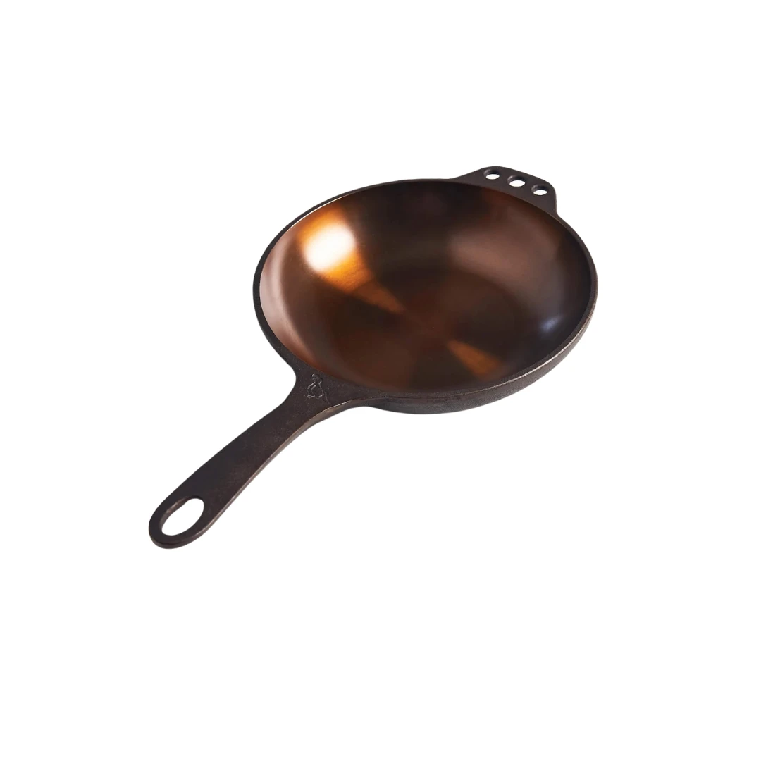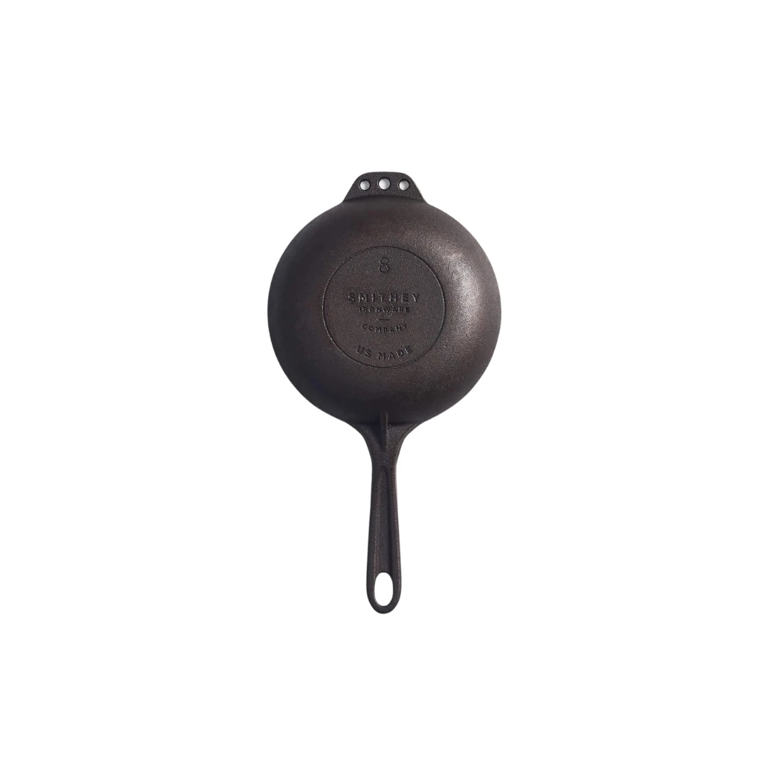 The 8″ skillet is designed to be a daily cooking companion. The smaller shape and curved interior sides promote movement and flipping, while the longer handle keeps your hands farther away from heat. Like all smithey skillets, the interior features a smooth polished finish that when seasoned is naturally non-stick. Ideal for sides, smaller meats, and the perfect fried egg, this skillet has a natural place beside its bigger siblings on the range. Use it well.