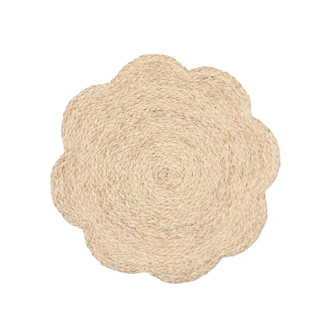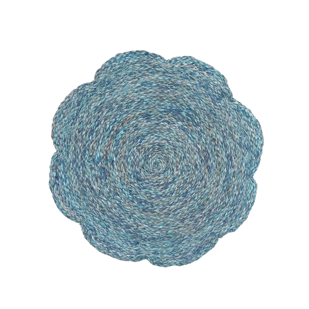 The Vera placemats usher in dining with their scalloped floral design. Natural woven bleached raffia is casually chic; Mixed Blue and Mixed Gray finishes create a more colorful setting. Fun, sustainable, and great for al fresco dining.