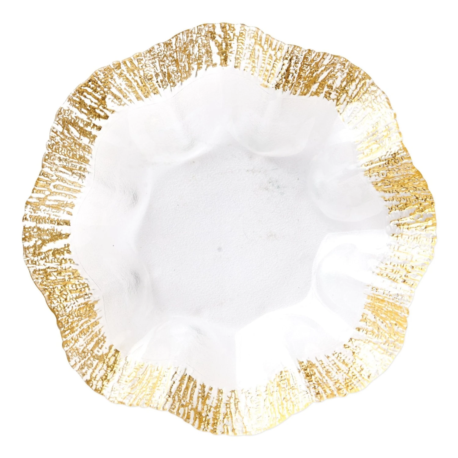 The Ruffle Glass gold platter features golden strands on the border of the elegantly ruffled platter.The embellishment is effortlessly beautiful. Handcrafted in Turkey. Handwash.