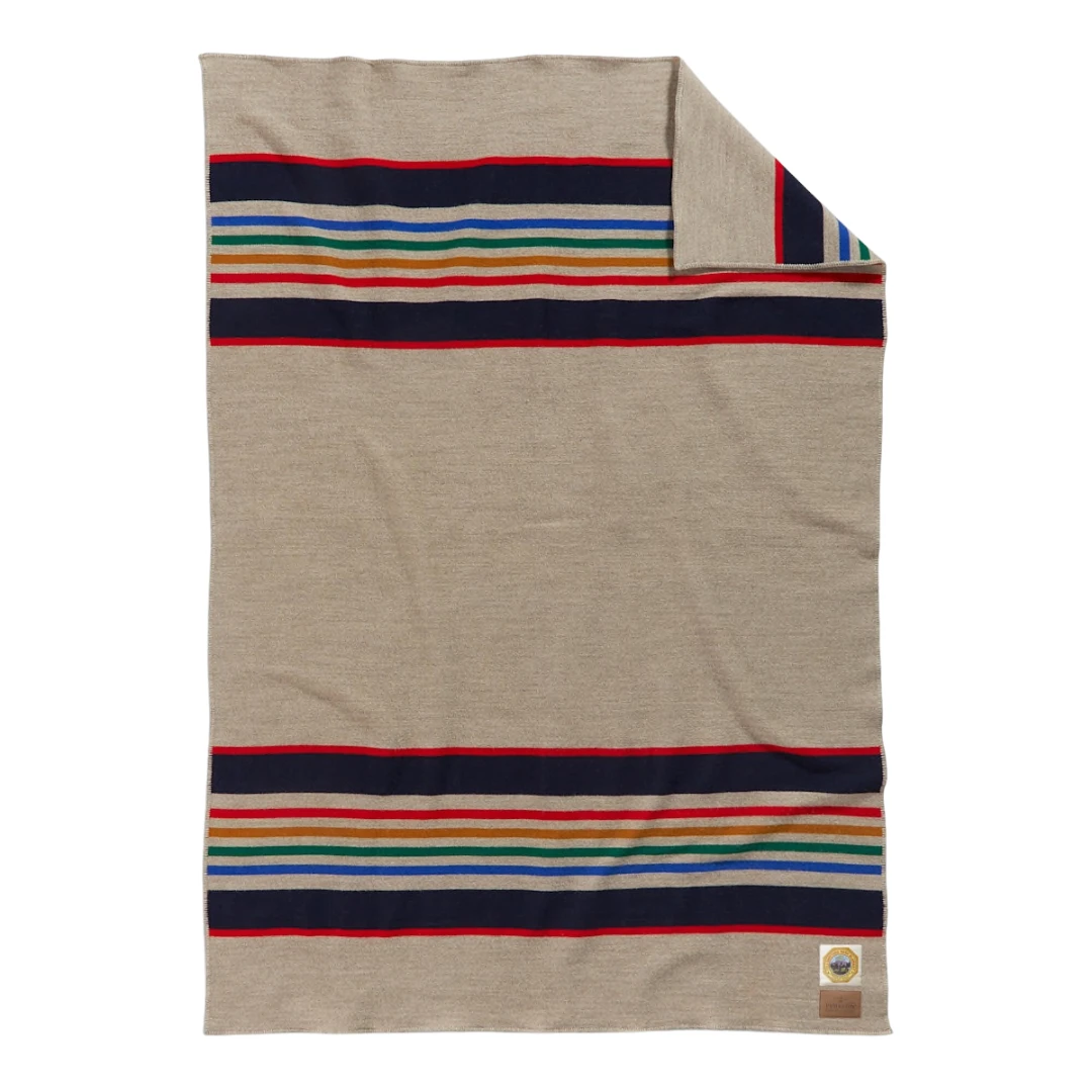 Adventure-ready throw with a leather carrier; part of the Pendleton National Park collection. Perfectly sized for the back of a couch or foot of bed. This blanket is also a welcome companion for road trips, picnics and outdoor concerts. Includes leather carrier for easy portability.